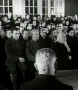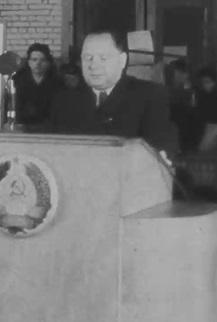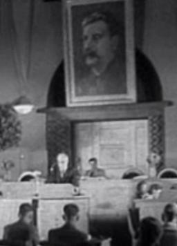 Johannes Lauristin kõneleb ENSV Ülemnõukogu istungite saalis märtsis 1941. Naised uutes ametites: trammijuht, vedurijuht, ettevõtte direktor.
